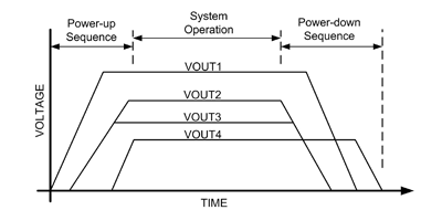 电压排序器是衍生自电压监测器的一种装置。电压排序器可用来驱动系统中电源供应的启用接脚,以提供多重电压电轨的通电及断电排序。图 4 显示多重电压电轨系统适用的通电/断电配置范例。电压会随着其他的系统电压在给定时间升降。电压排序器则用来控制和监视通电及断电时序。