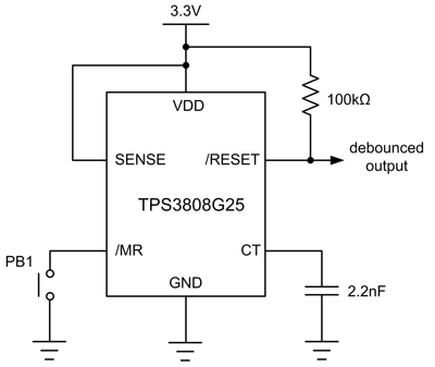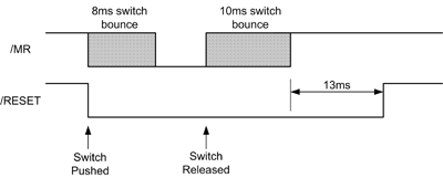 大多数的监测装置都有手动重设开关的输入,而开关与接脚连接 (一般标示为 MR)。按下开关时会启动重设,情况就好像是监测的电压降低。监测装置可用来将按钮连接于此接脚,以避免按钮开关弹回。重设时间必须比使开关不弹回或弹回的时间更长。图 6 显示电压监测装置做为开关弹回防制电路的范例,其中按钮开关连接于 TPS3808 的 MR 接脚。开关规格规定弹回时间较长 8 毫秒,而不弹回时间较长 10 毫秒。外部 2.2nF 电容将重设时间长度设定为 13 毫秒,这比不弹回或弹回的时间都要长。图 7 显示按钮输入及重设输出的预期波形。