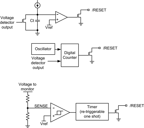监测装置的电压位准触发单次基本功能可用于预期用途以外的多种应用。例如,电压监测装置的其中一种常见应用是提供按钮开关的跳动消除机制。一般开启时,按钮开关都未按下,因此接点不会接触而形成电路。其中的机械部份会快速弹回,因此,在较终机械部份固定而形成电路之前,连接和中断连接的时间只有几毫秒。如果使用开关来引发边缘触发逻辑,开关弹回时会有多次逻辑错误触发的情形。放开按钮使得电路成为开路时,开关也会弹回。