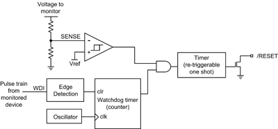 除了单纯监视电轨之外,某些监测装置也使用监控定时器 (WDT) 来监视 DSP 或微处理器程序代码的执行。监控定时器是一种特殊的计时装置,如果 DSP 或微处理器无法定期重设 WDT,便会触发系统重设。图 2 显示的是具有电压监视器及监控定时器的监测装置。一般而言,DSP 或微处理器输出接脚可用来驱动监测装置的监控输入。DSP 必须定时变更输出的逻辑状态,以产生脉冲序列。监控定时器会监视此脉冲序列。如果软件进入无限循环或中止程序,导致 DSP 停止产生脉冲序列,则监控定时器会逾时,而发出重设讯号来重新启动 DSP,并能从任何软件错误中恢复。从停止脉冲到重设的时间长度是由组成 WDT 电路的震荡器及计数器所决定的,并且须视装置而定。WDT 时间一般是 0.5 秒至 2 秒。