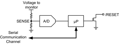透过数字方式也能够使用相同的监测装置功能。图 3 显示使用数字电路采用的相同电压监测装置。对于数字监测装置,仍然会划分出需要监视的电压,以提供模拟数字转换器 (ADC) 输入范围内的侦测电压 (SENSE)。接着 ADC 会将 SENSE 电压转换为微处理器可辨识的数字讯号。微处理器的 I/O 接脚可用来驱动开汲极 MOSFET,以提供重设讯号。数字监测装置可提供模拟监测装置所没有的功能。
