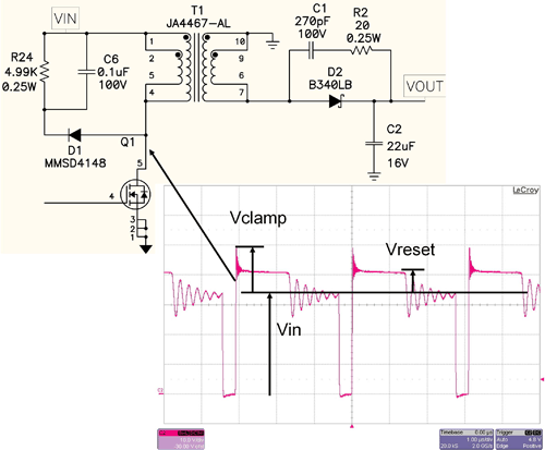 图 1 显示了反向转换器功率级和一次侧 MOSFET 电压波形。该转换器将能量存储于一个变压器主绕组电感中并在 MOSFET 关闭时将其释放到次级绕组。由于变压器的漏极电感会使漏电压升至反射输出电压 (Vreset) 以上,因此 MOSFET 关闭时通常会需要一个缓冲器。存储于漏极电感中的能量可使 MOSFET 产生雪崩现象,因此要添加一个由 D1、R24 和 C6 组成的钳压电路。该电路的钳位电压取决于漏电的能量大小以及电阻器的功率消耗。更小值的电阻虽然可以降低钳位电压,但会增加功率损耗。