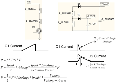 图 2 显示的是变压器主绕组和次级绕组的电流波形。左侧是 MOSFET 开启时的简化功率级。输入电流通过漏极电感和互电感的串联组合斜坡上升。右边显示的是关断期间的一个简化电路。此处,电压已反向至输出二极管和钳位二极管正向偏置的点。我们展示了反射到变压器一次侧的输出电容器和二极管。两个电感为串联,并在 Q1 关断时初始传输相同的电流。这就是说关断以后输出二极管 D2 中并未立即出现电流,同时总变压器电流在 D1 中流动。漏极电感的电压是钳位电压和重位电压之间的差,且往往会快速释放漏电。如图所示,经过简单计算便可得到分流至缓冲器的能量大小。因此您可以通过缩短释放漏极电感中能量的时间,来减少分流能量。提高钳位电压可以实现这一目标。