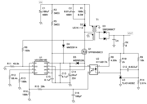 本文将重点介绍利用一个 TL431 并联稳压器关闭隔离电源的反馈环路。文章将讨论一种扩展电源控制环路带宽以改善瞬态负载及线路响应的方法。图 1 显示了一个离线隔离反向转换器的典型示意图。输出电压被向下分流,并与 TL431 的 2.5 V 参考电压比较。如果输出电压过高,TL431 就会通过其负极分流电流。该分流电流的一部分会流经光耦合器二极管 (U2),并反射在光敏晶体管中。镜像电流会增加 R16 的电压,其降低了功率 MOSFET 的峰值电流,从而使电源的输出电压降低。