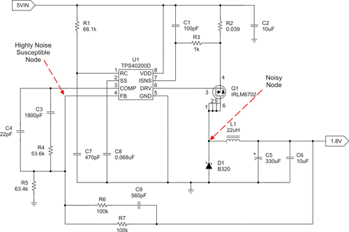 较严重的寄生电容问题通常会涉及反馈 (FB) 电压以及误差放大器补偿节点的布局。这是由于误差放大器输入的高阻抗、误差放大器的高增益,以及大量连接至该节点的组件。图 1 显示了典型控制器中出现这一问题的位置,以及一个较为可能的耦合节点。Q1 和 D1 之间的连接约有 0.1 V/ns 到 1 V/ns 的极高转换速率,并且会形成仅 1 pF 寄生电容的 1 mA 电流。
