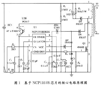 本文利用NCP1351B芯片良好的待机能耗和完善的保护功能的优点,简化了脑电采集仪电源的外围电路设计,从而减小体积、降低成本。