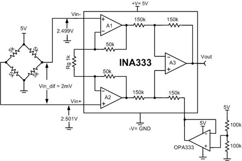 仪表放大器 (INA) 对小差动信号进行了放大。大多数 INA 都包括若干个电阻和运算放大器 (op amps)。虽然可以使用分立组件来构建这些 INA,但是使用单片集成电路 INA 的优点颇多。使用分立组件很难达到单片 INA 的精度和尺寸。