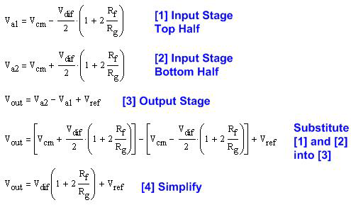 将图 10.5 中放大器的两半部分的结果整合起来可以得出差运放大器的方程式: Vout = Va2 – Va1 + Vref。接下来,把图 10.4 和图 10.5中较终传递函数的结果整合。请注意所有的增益都位于第一个级,第二个级将第一个级的差动输出转换成了一个单端信号。参考电压直接添加到了输出端(参考信号增益=1)。
