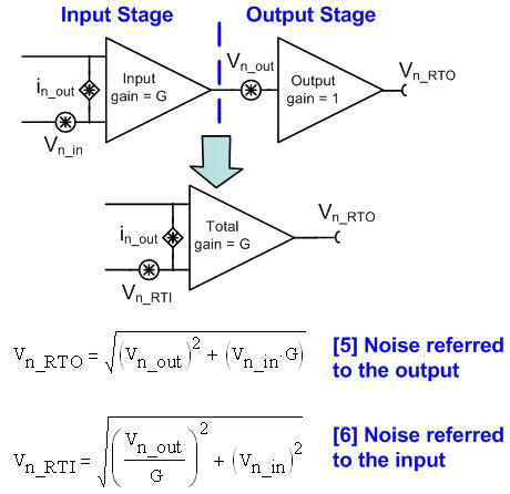 图 10.8 顶部的两级模型具一个输入级 (Vn_in) 电压噪声源和一个输出级 (Vn_out) 电压噪声源。Vn_RTO(输出电压噪声)识别整个 INA 的输出噪声。要计算噪声 Vn_RTO,可以将输入噪声方和根乘以增益和输出噪声相加(请参见图 10.8 中的方程式 5 )。要计算输入噪声,可以将输出噪声除以 INA 增益(请参见图 10.8 中的方程式 6)。