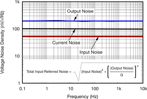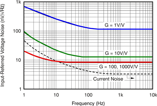 一些频谱密度曲线将输入级和输出级噪声整合到了一条曲线中。图 10.10 所示的INA128 噪声频谱密度曲线将输入和输出级的噪声整合到了一条曲线中。请注意,在不同增益时有多条曲线。就低增益而言,输入和输出级噪声都很明显(1-10 增益)。就较高的增益而言,输入噪声为主要噪声(100 -1000 的增益)。