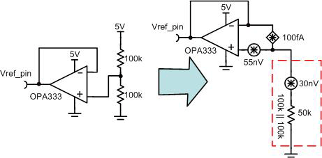 参考缓冲器的一个设计考虑因素是电阻分压器的散热噪声。用 10k 电阻替代 100k 电阻可以大大降低散热噪声。完成这一更改可以将输出噪声降至 55nV/rtHz 。进一步降低噪声的唯一方法就是更换运算放大器。根据应用