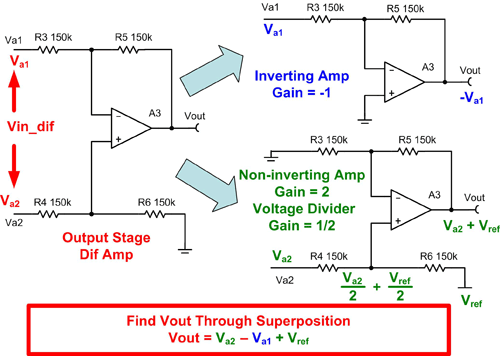图 10.5 显示了 INA 输出级的分析。该放大器拓扑通常被称为差动放大器 (diff-amp)。为了分析输出级,我们将放大器分为了两半,对每一半进分析并使用叠加将两个分析结果整合。放大器的上半部分是一个简单的反相放大器,增益为 -1:Vout = –Vin。