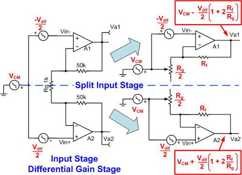 在图 10.4 中我们对称地将输入级的上半部分和下半部分分离后开始进行分析。放大器的每一半均可视为一个简单的、非反相放大器(增益= Rf/Rin +1)。请注意,增益设置电阻也被分成了两半,因此每一半的增益为:增益= 2Rf/Rg+1。请注意,共模电压 (Vcm) 向放大器每一半输出端的转移。