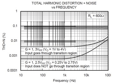 放大器的输入噪声是影响 THD+N 规范的另一个因素。高级别的输入噪声和/或高闭环增益都会增加放大器的总 THD+N 水平。