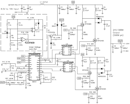 图 1 显示了一款使用了 TI 的TPS40090 多相降压控制器的 4 相、300W 升压电源,该转换器设计旨在处理一般会出现在音频应用中的 500W 峰值猝发。通常,在多相降压结构中,该控制器通过感应输出电感中的平均电流来平衡每一相位的电力。相反,在一个多相升压结构中,对电流的感应是在安装于每一个 FET 源极上的电阻器中进行的。通过在每一个 FET 中平衡峰值电流,多相控制器在所有升压相位中均匀地分配电力。来自控制器的栅极驱动信号为逻辑电平,因此每一个相位都要求具有一个 MOSFET 驱动器。本设计中,可以使用一个双通道 MOSFET 驱动器(例如:UCC27324)来减少组件的数量。