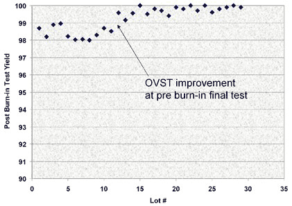 为了较大化超负载试验值:1)应提交超负载试验中出现故障的所有组件,以进行全面的电子及物理故障分析;2)找出每一种故障特征的根本原因;3)实施正确的校正措施。校正措施通常包括:从晶圆制造工艺技术本身减少缺陷,改进自动测试设备应力测试以提高故障检测机制效率,在工艺上游实施改进的异常值控制以将超负载试验的结果提高至 100% 良率。图 2 显示了根据逐步量产阶段了解到的情况实施测试增强以后得到的改进的超负载测试良率