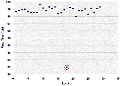 图 4 较终测试良率(超负载试验前)和标出不符合统计良率限值的点的示例图。该点是一个异常值,是要求进一步筛选和分析的风险点,也可能会出现不合格品。