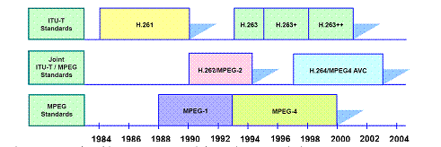 在视频编解码技术定义方面有两大标准机构。国际电信联盟 (ITU) 致力于电信应用,已经开发了用于低比特率视频电话的 H.26x 标准,其中包括 H.261、H.262、H.263 与 H.264;国际标准化组织 (ISO) 主要针对消费类应用,已经针对运动图像压缩定义了 MPEG 标准。MPEG 标准包括 MPEG1、MPEG2 与 MPEG4。图 1 说明了视频编解码标准的发展历程。