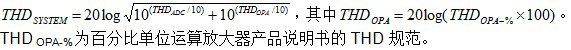 例如,由一个缓冲结构运算放大器驱动的 ADC 的总谐波失真,等于 ADC 和运算放大器失真贡献度的方和根。这种结构下,系统 THD 为: