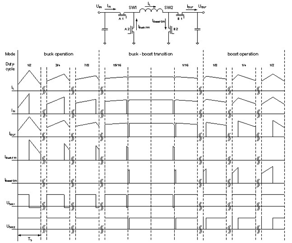 如果输入与输出电压非常接近,单独使用基本的降压或升压模式,都无法维持由封闭回路控制的稳定输出电压。一项可能的作法,就是在特定的输入电压水平,切换不同模式(为了稳定性,电压阈值具有磁滞现象)。另一种方式可能要以交替切换频率周期的做法,共同操作降压与升压模式,以确保稳定的输出电压及良好的瞬时响应。