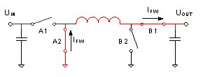 在降压模式中的操作,输入电压一定高于输出电压,在功能上类似于基本的降压拓朴。在降压模式中,转换器的升压开关(B1 与 B2)不会进行切换,B1 开关一定处于关闭状态,这样可让电流由电感流至输出电容器。B2 开关一定要开启,以免造成输出至接地 (GND) 的短路。