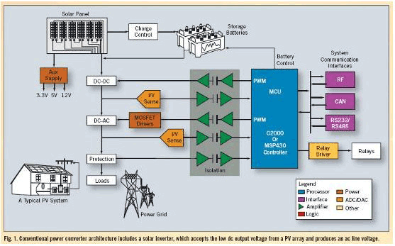在一个典型的太阳能采集系统中,多块太阳能板以并联方式连接到一个单逆变器,该逆变器将多个 PV 单元的可变 DC 输出转换成一种清洁的正弦曲线 50-Hz 或 60-Hz 电压源。