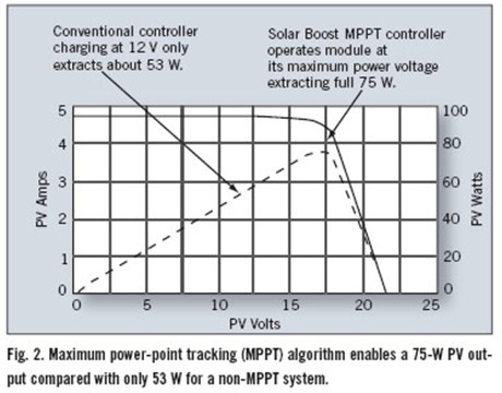 图 2 相比非 MPPT 系统的 53W,较大功率点追踪 (MPPT) 算法实现了 75-W PV 输出。