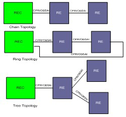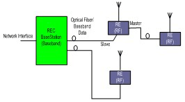 如图 1b-1c 所示,分布式基站构架 (DBSA) 消除了 RF 收发器对基站其他部分的依赖。这种构架允许 RE 迁至靠近其各自天线的地方,这样便将 RE 和天线之间的电气损耗降低到较小(请参见图1b),从而降低 RF 功率放大的成本。DBSA 还允许使用各种 RE 网络拓扑结构,例如:链状、环状或树状(如图 1c 所示)。由于射频设备可以相互组网在一起,无需每个 RE 都连接一个 REC,因此这种方法保证了一种相对较小的网络部署尺寸。