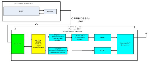 在反向链接中,射频单元包含所有模拟功能,以下变频 RF 频带至中频,然后数字下变频各个载波至基带同相正交 (I/Q) 对采样。多路复用基带采样 (I/Q) 与正向和反向链接中的控制和管理数据,均通过一个 SerDes 器件(例如:TI 的 TLK3134等)被串行化,然后通过光纤光缆传输。