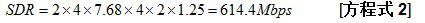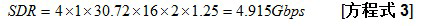 同样,使用方程式 1和表 1,四天线 LTE 系统、一载波/天线、30.72(M采样/s/载波)采样 20 MHz LTE 载波以及 16 比特/采样 I-Q 数据采样宽度条件下,原始串行速率如方程式 3 所示: