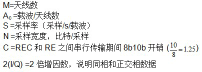 信道带宽 (MHz) 采样率(M 采样/s/载波) 5 7.68 10 15.36 15 21.04 20 30.72利用方程式 1 和表 1,四个 W-CDMA 载波 20 MHz 射频频率、双天线系统、7.68 (M采样/s/载波)采样率以及 4 比特/采样 I-Q 采样宽度条件下,原始串行速率如方程式 2 所示: