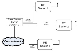 图 4 显示了一个实例,例子中一个 2G/3G/4G 基站或 REC 被连接到三个服务于三个部分的 RE。本实例中的三个 CPRI 链路在614.4 Mbps、3 Gbps 和 9.8 Gbps 线速率下获得配置,其假设 9.8 Gbps 为更新的 SDR,以支持 4G。