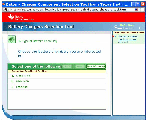电池充电器工具使得设计人员选择正确的充电器的过程更轻松。图 3 是 TI 网站上提供的一种工具的示例。