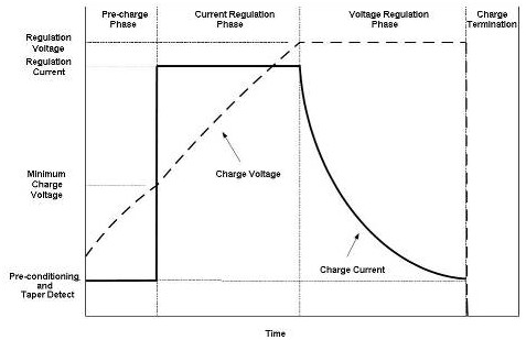 如图 2 所示,验证和预处理之后,先用一个 1C 或更低的电流对锂离子电池进行充电,直到电池达到其充电电压极限为止。该充电阶段通常会补充高达 70% 的电池容量。然后用一个通常为 4.2V 的恒定电压对电池进行充电。为将安全性和电池容量,必须要将充电压稳定在至少 ?1%。在此充电期间,电池汲取的充电电流逐渐下降。就 1C 充电率而言,一旦电流电平下降到初始充电电流的 10-15% 以下充电通常就会终止。