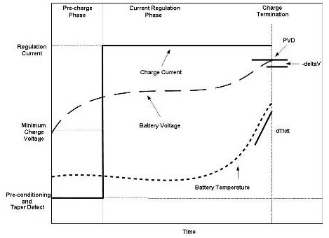 当电池温度和电压正确时快速充电开始。通常用 1C 或更低的恒定电流对 NiMH 电池进行充电。一些 NiCd 电池可以用高达 4C 的速率进行充电。采用适当的充电终止来避免有害的过充电。