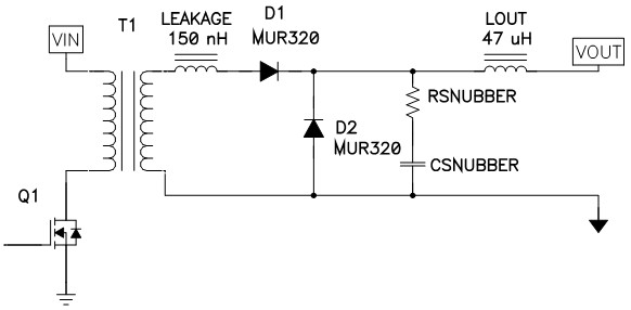 图 1 显示了正向转换器的功率级。该转换器由变压器运行,该变压器将输入电压耦合至次级电路,再由次级电路完成对输入电压的整流和滤波。反射主电压和变压器漏电感形成低阻抗电路,当 D2 通过一个这样电阻而被迫整流关闭 (commutate off) 时,通常需要一个缓冲器。D2 可以是一个硅 p-n 二极管,该二极管具有一个必须在其关闭前实现耗尽的逆向恢复充电功能。这就积累 (loads up) 了漏电感中的过剩电流,从而导致高频率振铃和过高的二极管电压。肖特基二极管和同步整流器也存在类似情况,前者是因为其大结电容,后者是因为其关闭延迟时间问题。