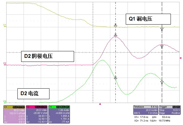 图 2 显示了一些电路波形,顶部线迹为 Q1 漏电压,中部线迹为 D1 和 D2 结点处的电压,底部线迹为流经 D1 的电流。在顶部线迹中,您可以看到当 Q1 打开时,其漏电压被降至输入电压以下,这样就使得二极管 D1 电流增加。如果 D2 没有逆向恢复充电功能,当 D1 电流等于输出电流时,结点电压就会上升。由于 D2 具有逆向恢复充电功能,因此 D1 电流会进一步增加,这便开始消耗电荷。一旦电荷耗尽,二极管便关闭,从而导致增加的结点电压进一步提高。请注意,电流会不断增加直到结点电压等于反射输入电压为止,因为在漏电感两端有一个正电压。随着电流的增加,该电流将对寄生电容进行充电并导致电路中振铃和损耗更大。