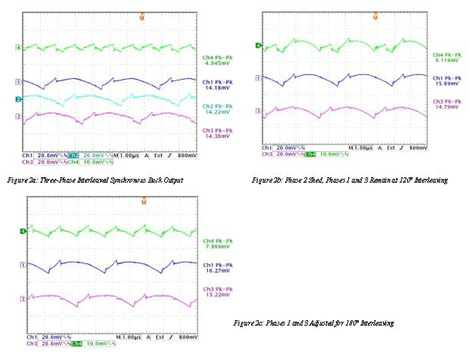 图 2a 显示了一款 120° 交错式(条件:10V 输入、2V 输出、3A 负载及300 kHz PWM 开关)PWM 结构的三相交错式降压转换器的示波器屏幕采集图。示波器通道 1 至 3 显示的是单个相位电压,而通道 4 显示的是交错式输出电压(所有示波器通道均为 AC 耦合)。通过所有运行中的三个相位,可以得出该输出纹波为 4.9 mV(输出电压的 0.25%)。在没有调整两个剩余相位(见图 2b)角的情况下,切除相位 2 会引起输出纹波增加 86%,即为9.1 mV。为了获得 180° 交错(见图 2c),对两个剩余相位进行软件调整以后,该纹波减少至 7.9 mV。在仍然比初始值大的同时(因为一个两相位系统无法获得如一个三相系统一样的低纹波),其比未被调整的剩余相位角提高了 13%。