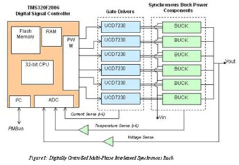 本文描述了一款数控多相交错式 DC/DC 降压系统,其可实现电压模式调节控制,并具有切相及增相和多相电流平衡的特点。使用传统模拟控制器来实施这些特性将会十分具有挑战性,而使用一款基于微处理器的数字控制器便可以轻松地完成这些任务。F2806 数字信号控制器与 UCD7230 栅极驱动及电流传感放大器的完美结合提供了一款完整的信号控制解决方案,并具有单机运行的片上闪存、同步高精度 PWM 模块、测量反馈信号的 ADC 以及 PMBus 通信功能。