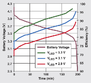 图 5 显示锂电池放电曲线上 TPS7510x LED 效率。在所有三条曲线中,整个放电范围的平均效率都超过 80%,并且在 VLED 为 3.3 V 时达到 90%。由于本文着重于低电流应用,因此,只要输入电压足够,TPS7510x 便能够使各个 LED 达到 25 mA。这些应用都具有体积尺寸极小的优点。