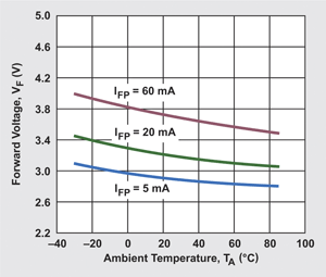 此图显示温度的关联性随着电流与正向电压的增加而更为显著。此外,一旦温度升高,正向电压便会降低。5 mA 曲线显示,从室温 (25°C) 变化至额定上限温度 (85°C) 时,正向电压大约降低 0.1 V。判断所需的正向电压时,应将此纳入考虑,不过其中的影响不甚明显。如果特定应用要求在极寒冷的环境下驱动 LED,则正向电压增加时,会使得低输入电压的亮度降低。