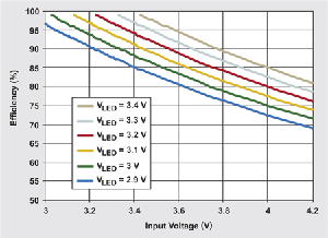 乍看之下,使用低漏失线性电路似乎不切合实际,因为线性调节器一直存在效率较低的问题。事实上,一般都对于 LDO 存在误解。LDO 效率完全根据输入/输出电压比而定,因此,驱动 WLED 的效率相当高。例如,以 3.6 V 锂电池的输入电力驱动 3 V WLED,能够达到 83% 的 LED 效率。图 4 显示锂电池范围内多种不同 WLED 正向电压的 TPS75105 效率。TPS75105 的 LED 效率不亚于甚至优于其它 WLED 驱动器解决方案。