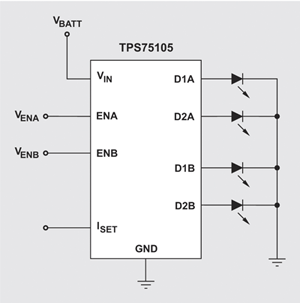 一般驱动多重 WLED 的方法是将这些 WLED 串联,然后以电感升压转换器或电荷泵驱动串联串行。对于需要较高正向电压的较高 WLED 电流而言,这是绝佳的方法。然而,如前所述,并不是所有的 WLED 驱动器应用都需要升压转换器。用于低电流 WLED 应用的简易、低成本驱动器为极小型 TPS75105 LED 驱动器 IC。TPS75105 属于线性电源,包含极低的 28 mV 漏失电压,适用于驱动分为单独两组的四个平行 WLED。此装置在单独启动的两组中提供四个 2% 相符电流路径。此装置采用极小型 9 球 1.5 平方毫米芯片级封装 (WCSP),不需要任何外部组件,即可使用预设电流输出,因此体积缩小为 1.5 平方毫米。值得一提的是,TPS75105 是德州仪器所提供其中一种成本较低廉的 WLED 照明解决方案,图 3 显示 TPS75105 的应用电路。