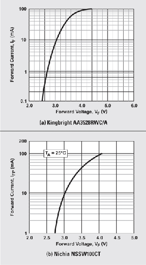 WLED 与其它标准 p-n 接面二极管类似,必须有足够的正向电压才能导电。当电压超过临界值时,会以 WLED 的正向电压提升正向电流。图 1 显示两个 WLED 的一般 I-V 曲线。