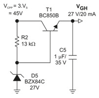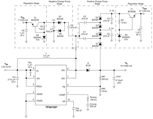图 1 显示了一种外部正充电泵结构,在调低至电压 VGH (27V) 以适合此应用之前,该结构所提供的电压较多可 3 倍于升压转换器的输出电压 VS,即 45V。在这种情况下,负充电泵的稳压级会将输出电压 VGL 从升压转换器所生成的 -15V 电压调节至 -7 V。
