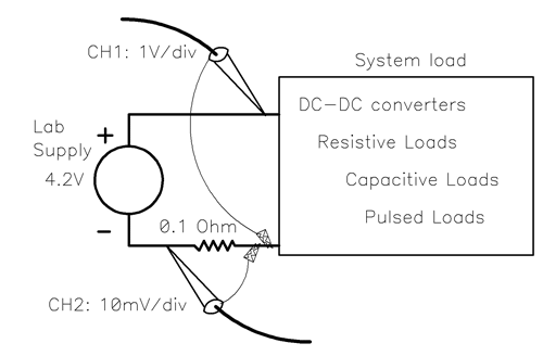 实时运行对比有助于理解负载瞬态时间,并确定峰值负载不会超过可用源电流。将系统负载连接至一个实验室电源就可以进行一个简单的测试。在回路中插入一个 100m Ohm 电阻,并设置电源电压为 4.2V。如图 4 所示连接示波器探针,以捕获电压和电流。使用单序列触发器时,设置示波器到电压波形,并开启实验室电源。利用热插拔,可重复该测试。通过电流触发(刚好设定在充电器编程控制电流阈值以下)可实现连续运行测试,同时以系统各种运行模式来运行系统。应该在整个系统的 VSYS 运行范围中进行这种测试。如果示波器得到触发,则需检查电流脉冲并确定负载是否过高。