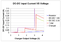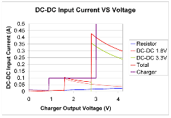 电阻性负载会吸收电流,该电流与施加的电压成比例关系,并且可出现在上电阶段。在无电池上电时,低于 125 Ohms (ISINK = 1V/125 Ohms = 8mA) 的电阻可以阻止充电器退出短路模式。一般而言,一个 DC/DC 降压转换器在其输入电压接近其调节输出电压时才被启用。由于转换器的输出电压固定,因此其负载通常恒定不变,这样其输入电流便与其电压成反比关系。图 3 中的两条曲线显示了流入一个 1.8V 和 3.3V DC/DC 转换器的输入电流与输入电压之间的对比关系。您可以看到,电压上升则电流下降,反之亦然。一般来说,电容性负载在转换器的输入端并不是一个问题,同时它会减缓上电,除非一个定时事件结束从而引起重置或进一步加载。上电时转换器输出的电容性负载可能会带来峰值功率要求,同时如果该转换器具有软启动特性,则这种负载可以降低。脉冲负载会加给其他静态负载,并且这种情况随时可能发生,因此我们在进行无电池操作时应该特别注意,要确定峰值负载不会超过可用充电器源电流。
