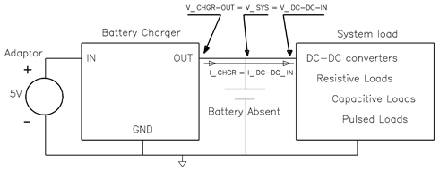 系统在没有电池的情况下依靠充电器工作正变得越来越普遍。这种情况可能会出现在正常应用或厂商的产品测试期间。图 1 中,在任何瞬态或上电条件下都没有电池电源为系统供电。如果设计不够合理,则充电器就会在短路状态下锁闭。要想解决这些设计问题,我们必须充分理解充电器的输出源规范和输入系统负载要求。