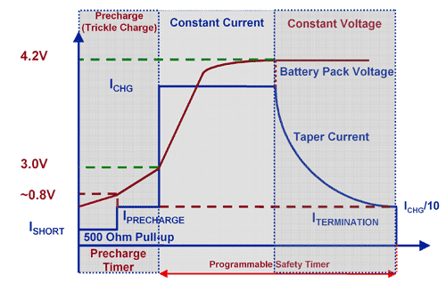 一旦高于短路阈值 (0.8~1.4V),充电器便会进入预充电模式。预充电对深度放电的电池进行恢复,或决定该电池组是否受到破坏以及是否需要终止充电。预充电电流约为快速充电电流的 1/10,但是某些充电器可以单独编程控制这一水平。预充电模式在 ~3V 时转为快速充电恒定电流,这时便获得了编程控制快速充电恒定电流。充电器决不会提供比这种编程控制电流电平更多的电流。电压在 4.2V 时达到恒定电压模式后,输出得到调节,并且能够提供达到编程控制电流电平的电流。如果负载电流降至终止阈值,则充电终止,除非终止功能失效。