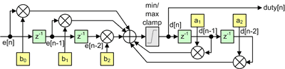 除了监控小信号 AC 传输函数以外,数字控制器还可以访问瞬时和平均占空比。在数字 PWM 控制器中,由数字滤波器来完成补偿(请参见图 3)。该滤波器的输出与稳定输出电压所需的控制程度成正比例关系。由于该滤波器是数字的,因此滤波器的输出可以很轻松地通过监控微处理器来进行采样。实际上,数字电源《PMBus 指令标准 (PMBus Command Standard)》的作者早就预知到了这一点,并定义了标准指令:READ_DUTY_CYCLE。